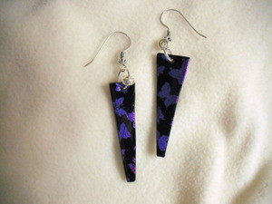 Irredescent purple/blue butterflies on black diochromic glass. Sterling silver wires and accents. 1.75 ''