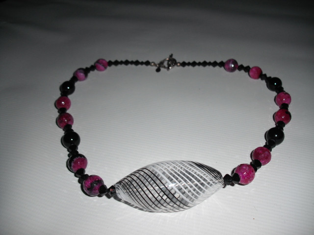 Focal bead is clear Venetian glass with black and white stripes. Other beads are raspberry agate with black swirls. Also black onyx. Black Swarovski crystals. Sterling toggle. 20 inches.