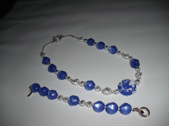 Focal bead is blue matte with white floral accents. Blue ( more of a silvery sky blue than the photo shows) Venetian glass beads; white on silver foil Venetian glass beads. Clasp on necklace is sterling silver with white moon stone center. Necklace is 20 inches long; bracelet is 8 inches.