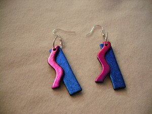Dichromic glass; fuschia squiggle on royal blue rectangle. Silver wires. 1.5 inches