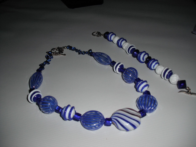 Necklace and bracelet set...Assorted Venetian glass beads in blue and white,Dyed blue irregular shaped fresh water pearls. Shades of blue may be deeper than shown in photo due to camera/ computer. Bracelet is 8 inches; necklace is 17 inches.
